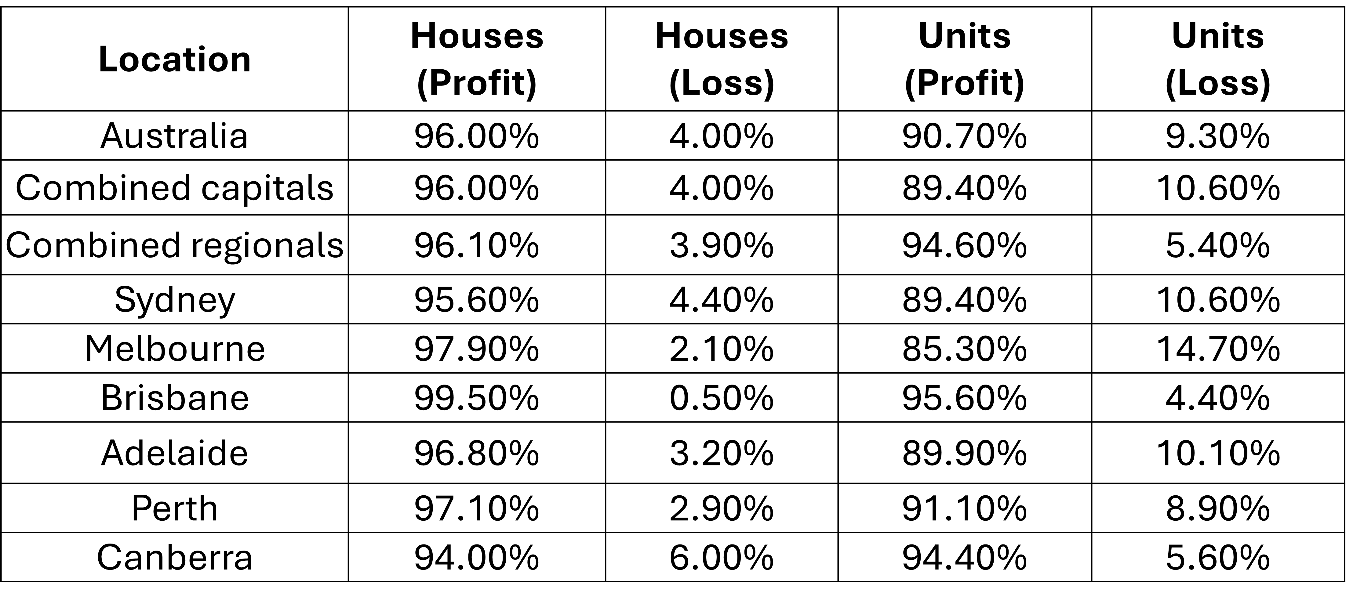 For units, Hobart takes the lead with 96.3% of sales resulting in a profit, while Darwin lags behind with only 68.2%. Sydney, Hobart, and Adelaide lead in unit dollar gains, driven by a shortage of affordable apartments in their CBDs.