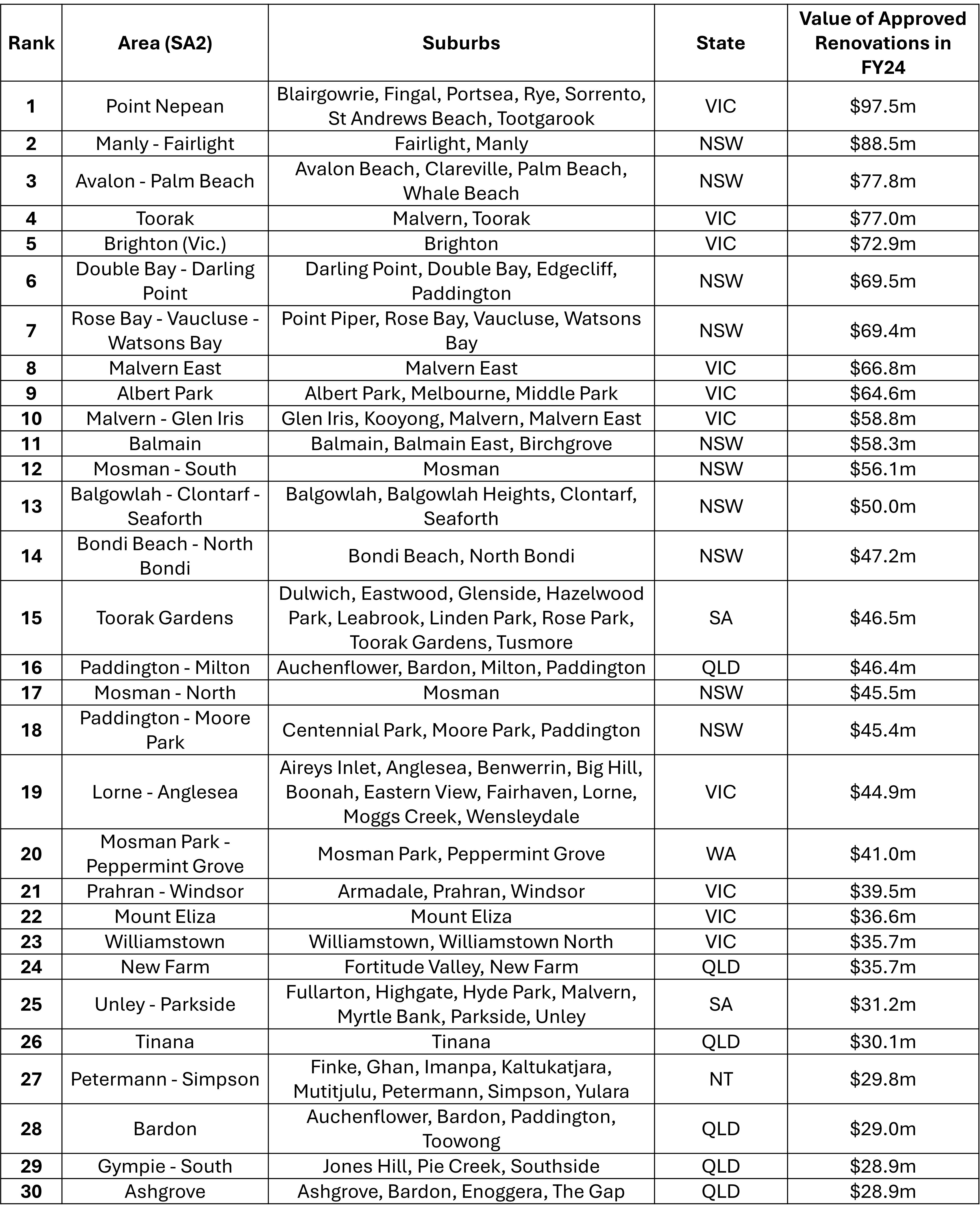 For those looking to invest or renovate, the top 30 regions with the highest value of approved renovations are listed below, showcasing where property values are likely to surge next: