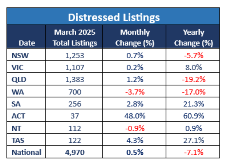 Distressed listings ticked up slightly to 4,970—a 0.5% increase. NSW and VIC had minor rises, but nothing suggests a wave of mortgagee stock.
