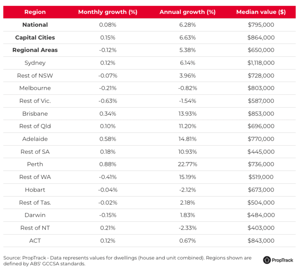 Despite high interest rates, Australia’s median home value reached a new record in July. The PropTrack Home Price Index showed only a slight national price increase of 0.08% for the month. However, areas with relative affordability, like Perth, Adelaide, and Brisbane, saw significant year-over-year growth.
