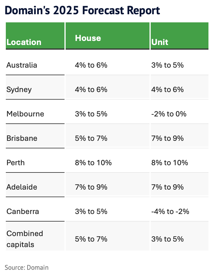 The Domain 2025 Forecast Report projects a national average increase in house prices between 4% and 6%. Sydney’s house and unit prices are forecast to follow this trend, while Melbourne is expected to see weaker growth of 3% to 5% for houses and no growth or slight declines of up to 2% for units.