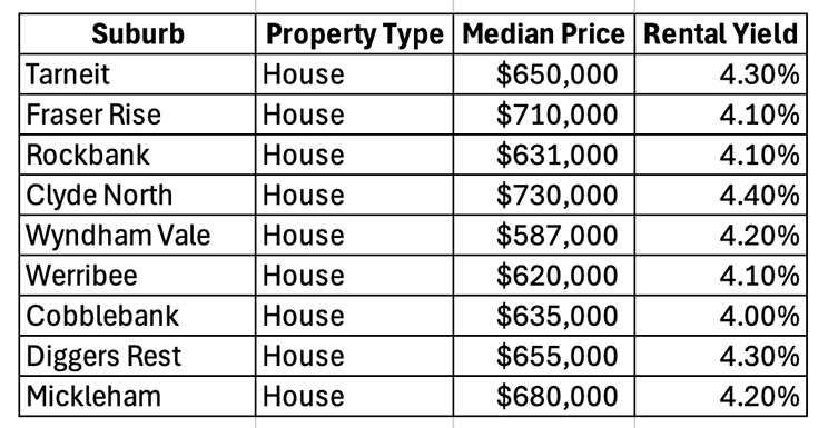 Tarneit leads the way in Victoria, offering affordability, excellent infrastructure, and population growth. Nearby suburbs like Fraser Rise and Rockbank also stand out for their investment potential.