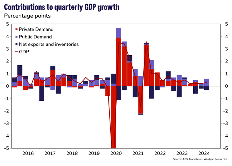 The purple columns, representing public sector demand, have effectively kept the economy afloat. Remove them, and Australia would have experienced two consecutive quarters of contraction—commonly defined as a recession.