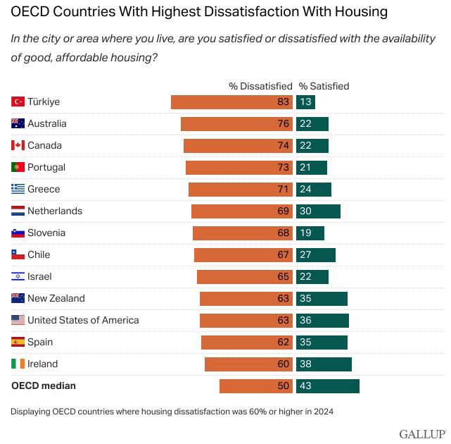 Australia’s housing crisis is deepening, with dissatisfaction levels among the highest in the OECD, second only to Turkey. A new Gallup survey reveals a grim outlook – especially for younger Australians, whose dreams of homeownership are slipping further out of reach.