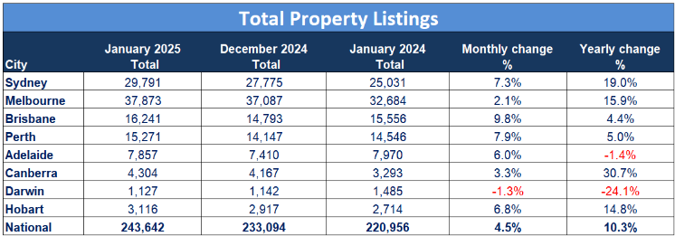 The Australian property market is off to a strong start in 2025, with SQM Research reporting a 4.5% increase in total property listings for January. This brings the total to 243,642 listings, marking a 10.3% year-over-year rise – a strong indicator of renewed market confidence and potential opportunities for investors and buyers alike.